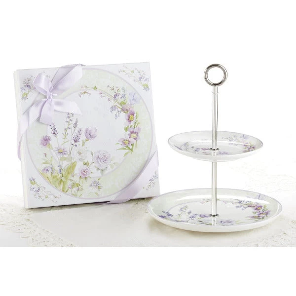 11″ Porcelain 2-Tier Dessert Stand Lavender Rose In Gift Box