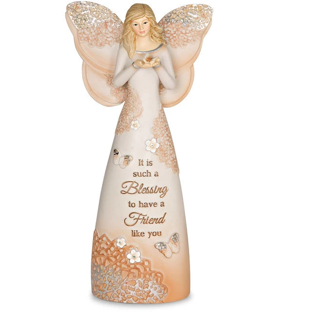 This beautiful angel is a perfect gift for a friend. It features soft colors and delicate metallic accents. The text “It Is Such A Blessing To Have A Friend Like You” is debossed and hand-painted onto the front of the angel, alongside an intricate butterfly and flower design. She will know how much you appreciate her friendship.