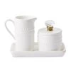 Stoneware dessert plate from Mud Pie features gold rim, raised gold mini dots and “Let’s Celebrate Everyday” scripted sentiment.