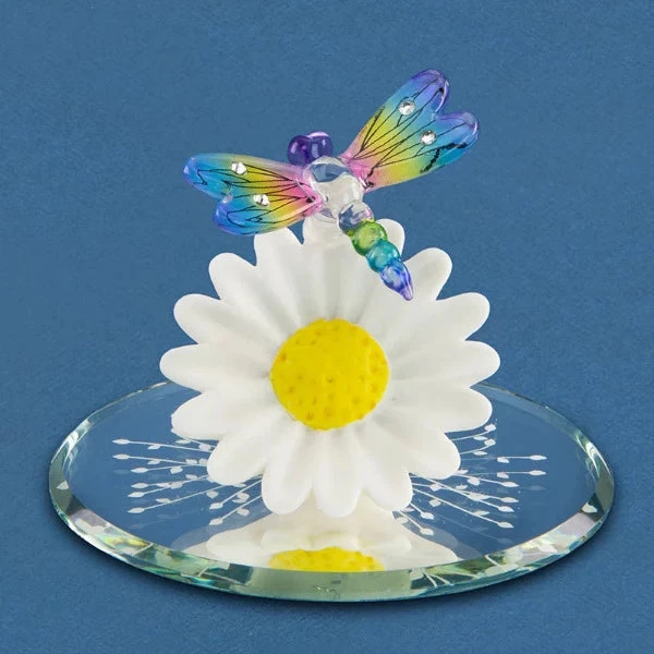 • Handcrafted figurine of a ladybug perched on a daisy, placed on a hand beveled glass mirror.
