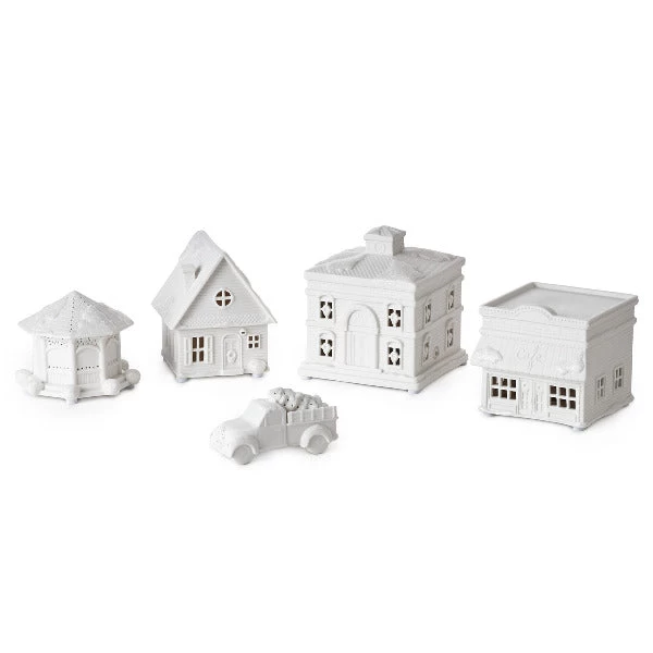 - Hallmark Channel Christmas village features five white porcelain pieces—City Hall, house, café, gazebo and truck—that light up and play music.