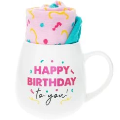 Great for gifting to a loved one. Happy Birthday To You” text and accompanying design is printed onto the front of the mug, while the socks feature a sewn-in streamers pattern.