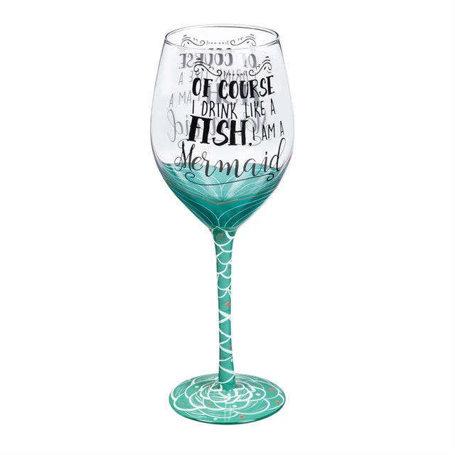 Serve a special drink in this uniquely designed wine glass. The wine glass has a mermaid tail design on the stem reads, “Of course I drink like a fish, I am a mermaid.” The glass comes in a coordinating gift box. It holds approximately 12 ounces.