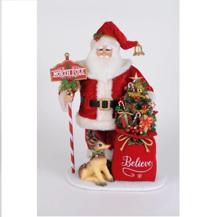 Our Lighted North Pole Magic Santa serves as a beautiful center or accent piece to your Christmas decor. He is part of the Karen Didion Signature Collection. The quality is unmatched with this decorative piece’s hand-painted face, inset eyes, unique fabric, and detailed accessories. With this collectible’s traditional design and incredible detail, he’s sure to add character and style to any home. Lights are battery operated. This piece takes 2 CR2032 batteries.