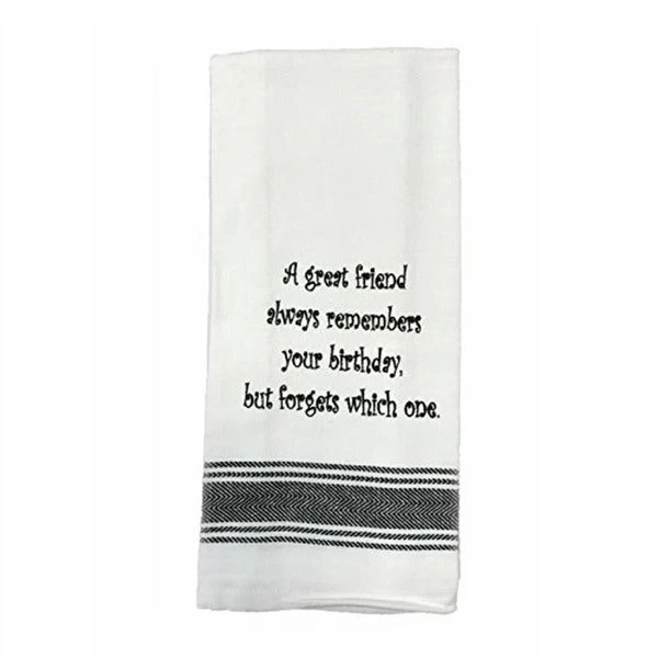 Print on towel reads: “A Great Friend Always Remembers Your Birthday But Forgets Which One”Â