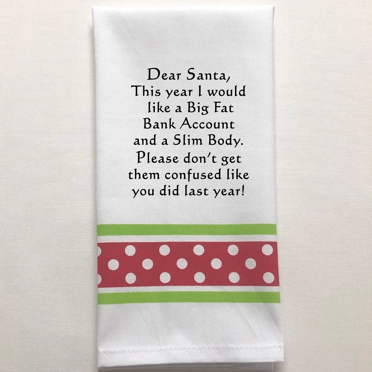 Print on towel reads: “Dear Santa, This Year I would like A Big Fat Bank Account and a Slim Body. Please don’t get them confused like you did last year!”