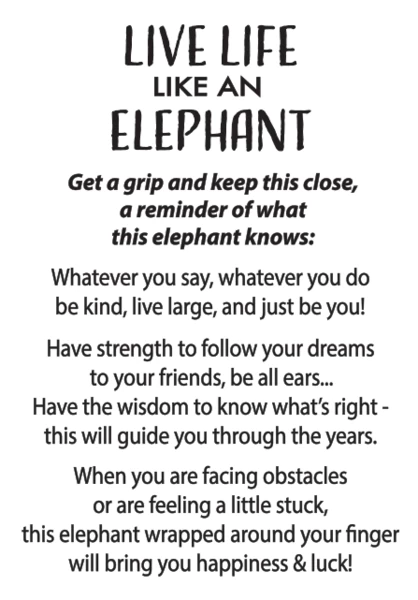 Whatever you say, whatever you do, be kind, live large, and just be you! Have strength to follow your dreams. To your friends, be all ears… Have the wisdom to know what’s right – this will guide you through the years. When you are facing obstacles or are feeling a little stuck, this elephant wrapped around your finger will bring you happiness & luck!