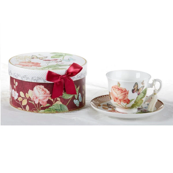 Porcelain Tea Cup & Saucer Burgundy Peony In Gift Box