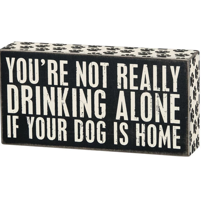 A classic black and white wooden box sign lending a distressed “You’re Not Really Drinking Alone If Your Dog Is Home” sentiment with paw print patterned trim. Easy to hang or can free-stand alone.